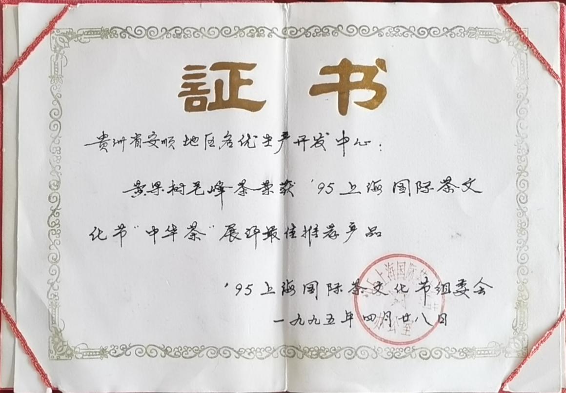 黃果樹毛峰茶榮獲95上海國際茶文化節“中華茶”展評最佳推薦產品