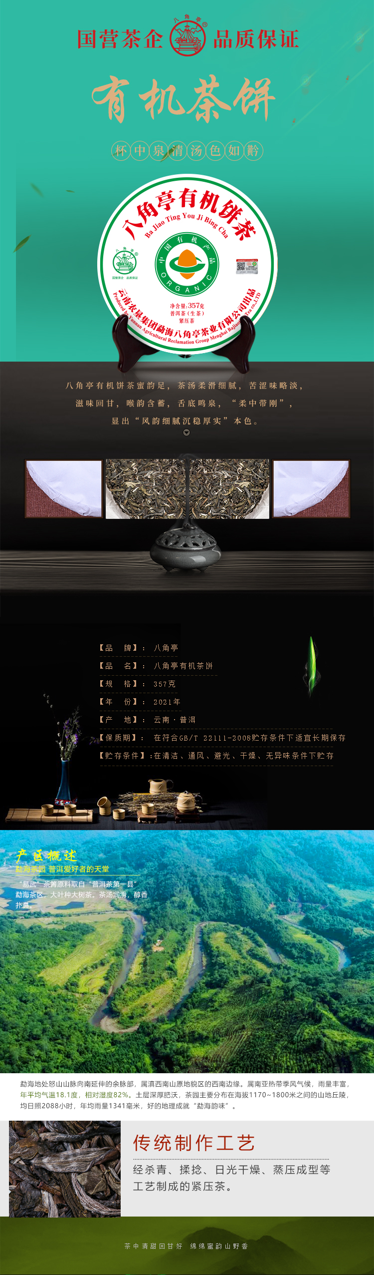 云墾茶業(yè)集團下屬茶葉生產(chǎn)企業(yè)——云南農(nóng)墾集團勐海八角亭茶業(yè)有限公司原名黎明茶廠,是我國歷史最為悠久的茶企之一,曾位列“中國普洱茶十大知名品牌”“十大最受歡迎茶葉品牌”、“中國普洱茶十大暢銷品牌”中,成為今天市場上最有影響力的品牌之一。公司產(chǎn)品獲得“綠色食品”、ISO9001、 HACCP和云茶品牌(YC)4項認證,連續(xù)獲得“云南名牌農(nóng)產(chǎn)品”“云南名牌產(chǎn)品”“云南省著名商標”等品牌榮譽,公司生產(chǎn)的多款普洱茶在歷次專業(yè)評比中多次獲得特等金獎和金獎。在2018第五屆中國企業(yè)五星品牌論壇上,云南農(nóng)墾集團勐海八角亭茶業(yè)有限公司上榜中國普洱茶行業(yè)影響力品牌——“金芽獎”,公司負責人陳勝軍先生獲“陸羽獎”,被授予2017“國際十大杰出茶人”榮譽稱號。