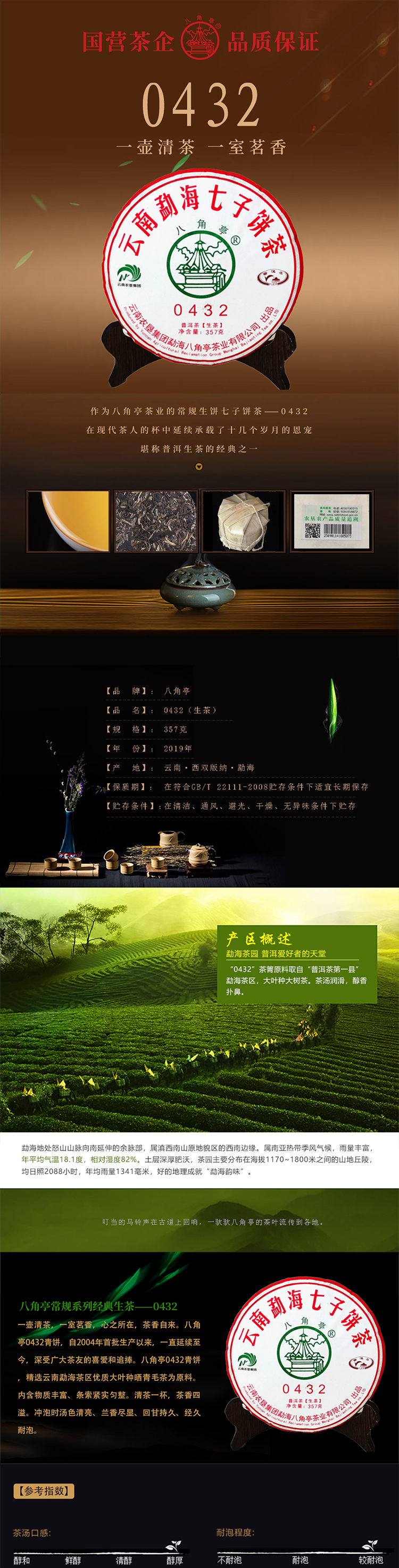 云墾茶業(yè)集團下屬茶葉生產(chǎn)企業(yè)——云南農(nóng)墾集團勐海八角亭茶業(yè)有限公司原名黎明茶廠,是我國歷史最為悠久的茶企之一,曾位列“中國普洱茶十大知名品牌”“十大最受歡迎茶葉品牌”、“中國普洱茶十大暢銷品牌”中,成為今天市場上最有影響力的品牌之一。公司產(chǎn)品獲得“綠色食品”、ISO9001、 HACCP和云茶品牌(YC)4項認證,連續(xù)獲得“云南名牌農(nóng)產(chǎn)品”“云南名牌產(chǎn)品”“云南省著名商標”等品牌榮譽,公司生產(chǎn)的多款普洱茶在歷次專業(yè)評比中多次獲得特等金獎和金獎。在2018第五屆中國企業(yè)五星品牌論壇上,云南農(nóng)墾集團勐海八角亭茶業(yè)有限公司上榜中國普洱茶行業(yè)影響力品牌——“金芽獎”,公司負責人陳勝軍先生獲“陸羽獎”,被授予2017“國際十大杰出茶人”榮譽稱號。