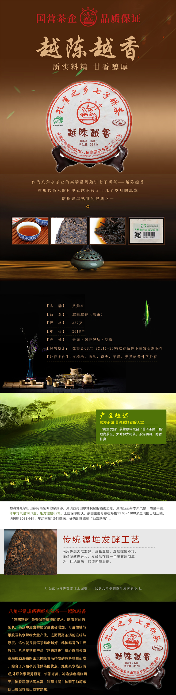 云墾茶業(yè)集團(tuán)下屬茶葉生產(chǎn)企業(yè)——云南農(nóng)墾集團(tuán)勐海八角亭茶業(yè)有限公司原名黎明茶廠,是我國歷史最為悠久的茶企之一,曾位列“中國普洱茶十大知名品牌”“十大最受歡迎茶葉品牌”、“中國普洱茶十大暢銷品牌”中,成為今天市場上最有影響力的品牌之一。公司產(chǎn)品獲得“綠色食品”、ISO9001、 HACCP和云茶品牌(YC)4項(xiàng)認(rèn)證,連續(xù)獲得“云南名牌農(nóng)產(chǎn)品”“云南名牌產(chǎn)品”“云南省著名商標(biāo)”等品牌榮譽(yù),公司生產(chǎn)的多款普洱茶在歷次專業(yè)評比中多次獲得特等金獎(jiǎng)和金獎(jiǎng)。在2018第五屆中國企業(yè)五星品牌論壇上,云南農(nóng)墾集團(tuán)勐海八角亭茶業(yè)有限公司上榜中國普洱茶行業(yè)影響力品牌——“金芽獎(jiǎng)”,公司負(fù)責(zé)人陳勝軍先生獲“陸羽獎(jiǎng)”,被授予2017“國際十大杰出茶人”榮譽(yù)稱號。