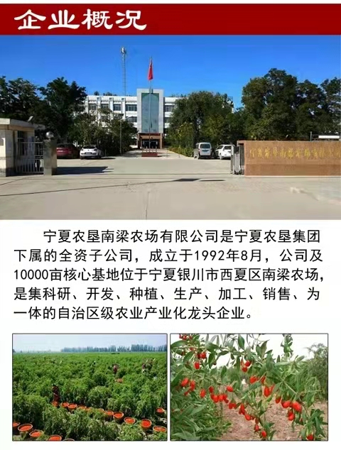 寧夏農墾南梁農場有限公司【原寧夏枸杞企業(集團)公司】成立于1992年8月,位于銀川市西夏區南梁農場,是寧夏農墾集團有限公司所屬的枸杞種植、加工、銷售為一體的專業化公司。已有50多年的枸杞栽培歷史,所產枸杞素以粒大、肉厚、籽少、味甜、藥效高而居寧夏枸杞之冠。